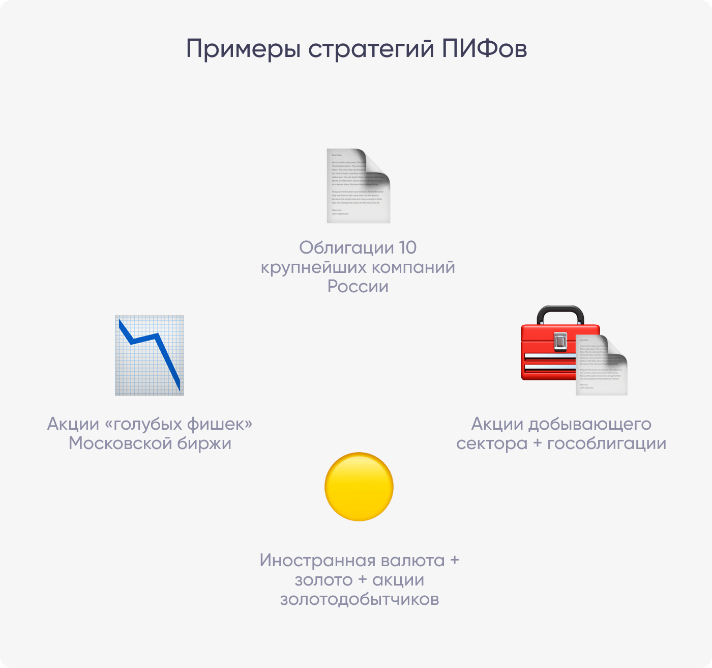Выбор инструментов определяется стратегией фонда. Например, если ПИФ вкладывается только в облигации или только в драгоценные металлы.