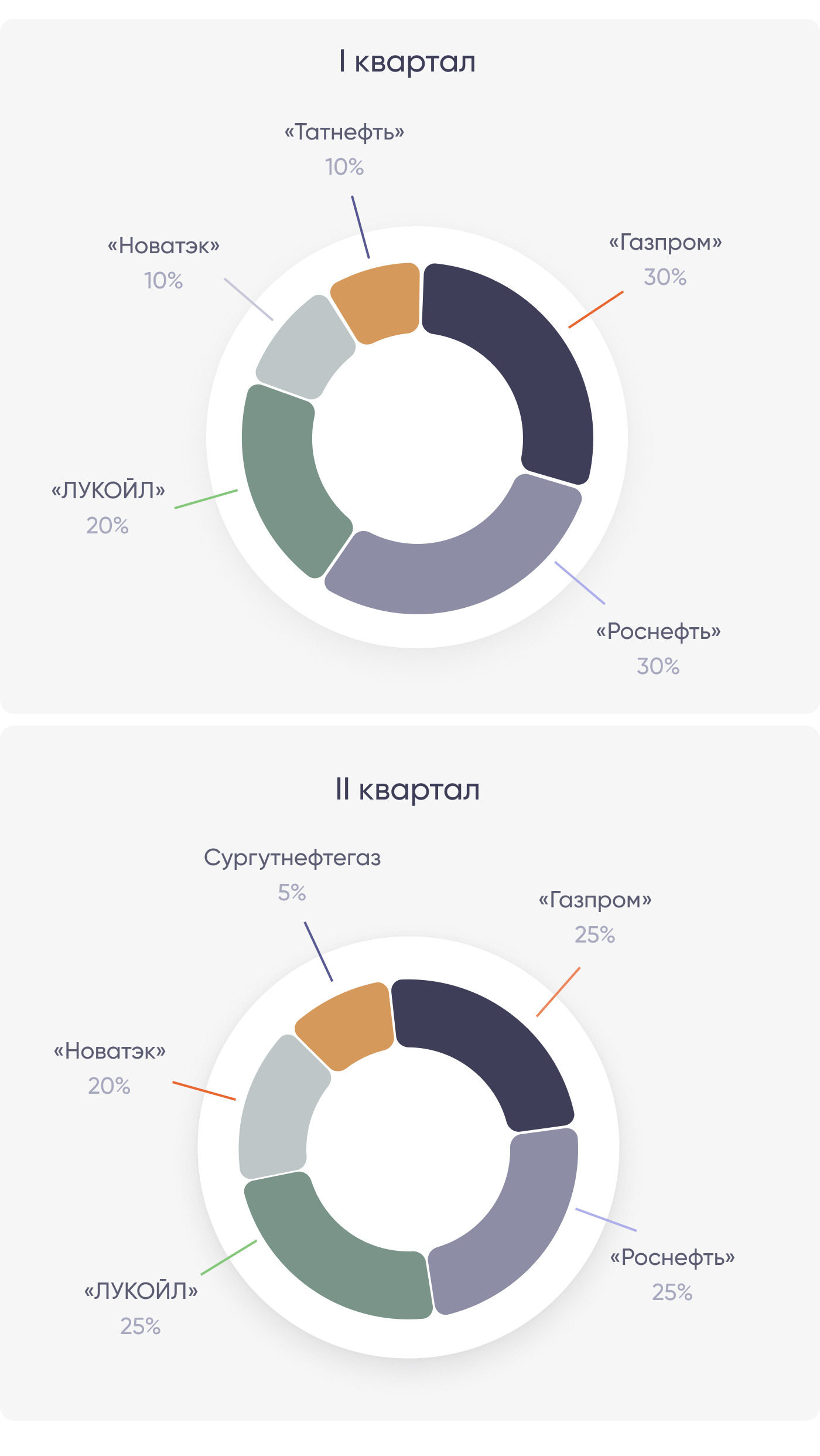 Допустим, есть фонд «Нефть и газ России». Он инвестирует в акции российских нефтегазовых компаний. В первом квартале портфель состоял из бумаг «Газпрома»6, «Роснефти»7, «ЛУКОЙЛа»8, «Новатэка»9 и «Татнефти»10. Во втором квартале управляющие исключили акции «Татнефти», добавили вместо них бумаги Сургутнефтегаза11, а также изменили доли других бумаг. Стратегия фонда осталась прежней, состав — нет.
