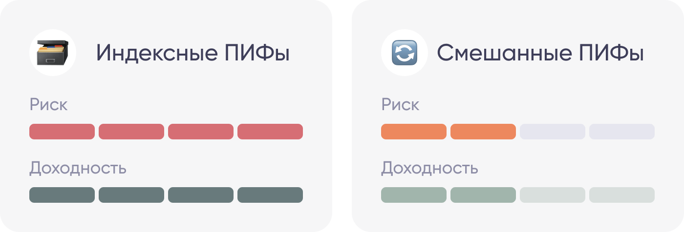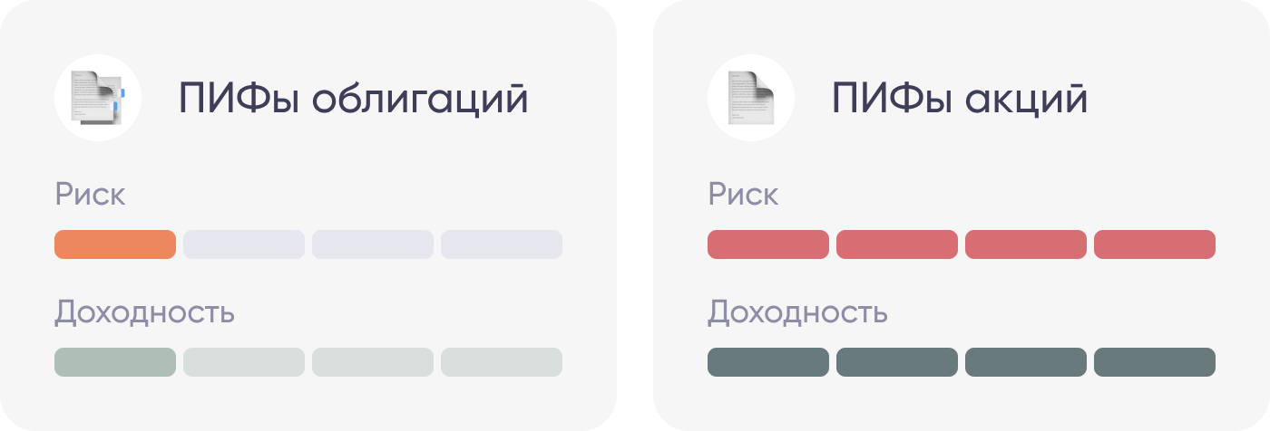 ПИФы акций. Фонды, которые инвестируют в акции. У этих вложений риск более высокий, но и доходность тоже может быть большая.