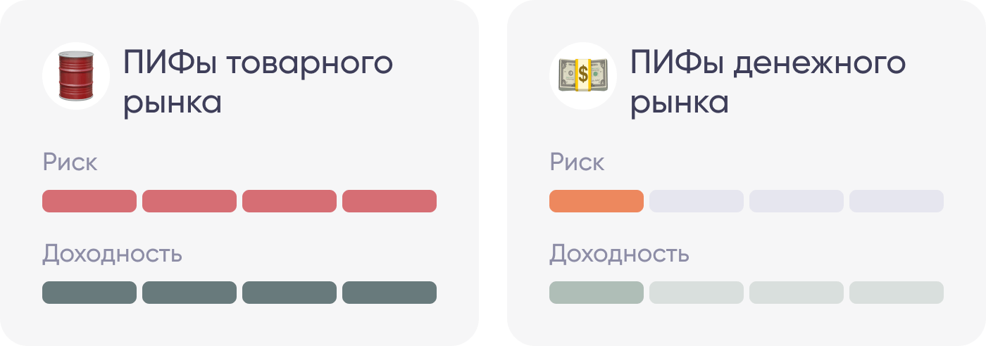 ПИФы денежного рынка. Фонды, которые инвестируют в инструменты денежного рынка: краткосрочные государственные и корпоративные облигации или краткосрочные рублевые депозиты. Этот инструмент подходит для размещения денег на короткий срок с минимальным риском, невысокой доходностью и похож на накопительный счет в банке.