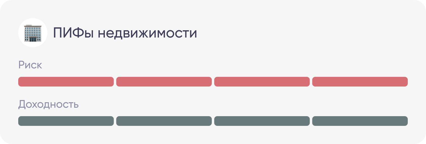 ПИФы недвижимости. Фонды, которые инвестируют в коммерческую и жилую недвижимость. Как правило, управляющая компания приобретает квадратные метры, чтобы потом сдавать их в аренду или перепродать. Такие фонды подходят далеко не всем: для них нужны большие вложения и базовое понимание, что происходит на рынке недвижимости.
