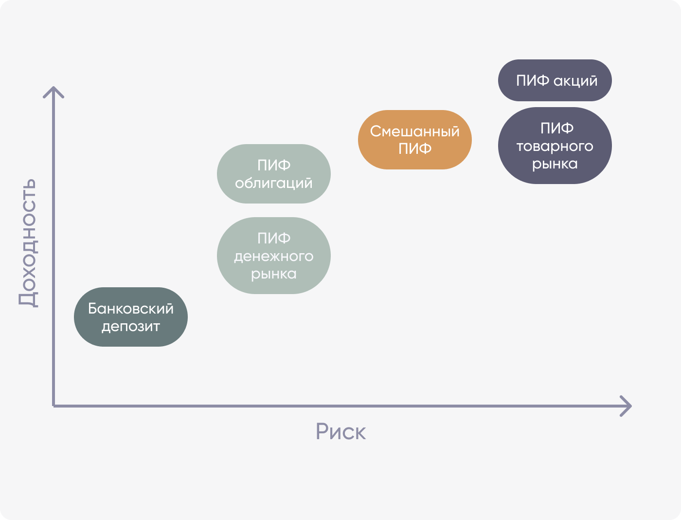 Если сравнивать ПИФы из разных инструментов с банковским депозитом, то самыми похожими с точки зрения рисков будут ПИФы облигаций и денежного рынка.