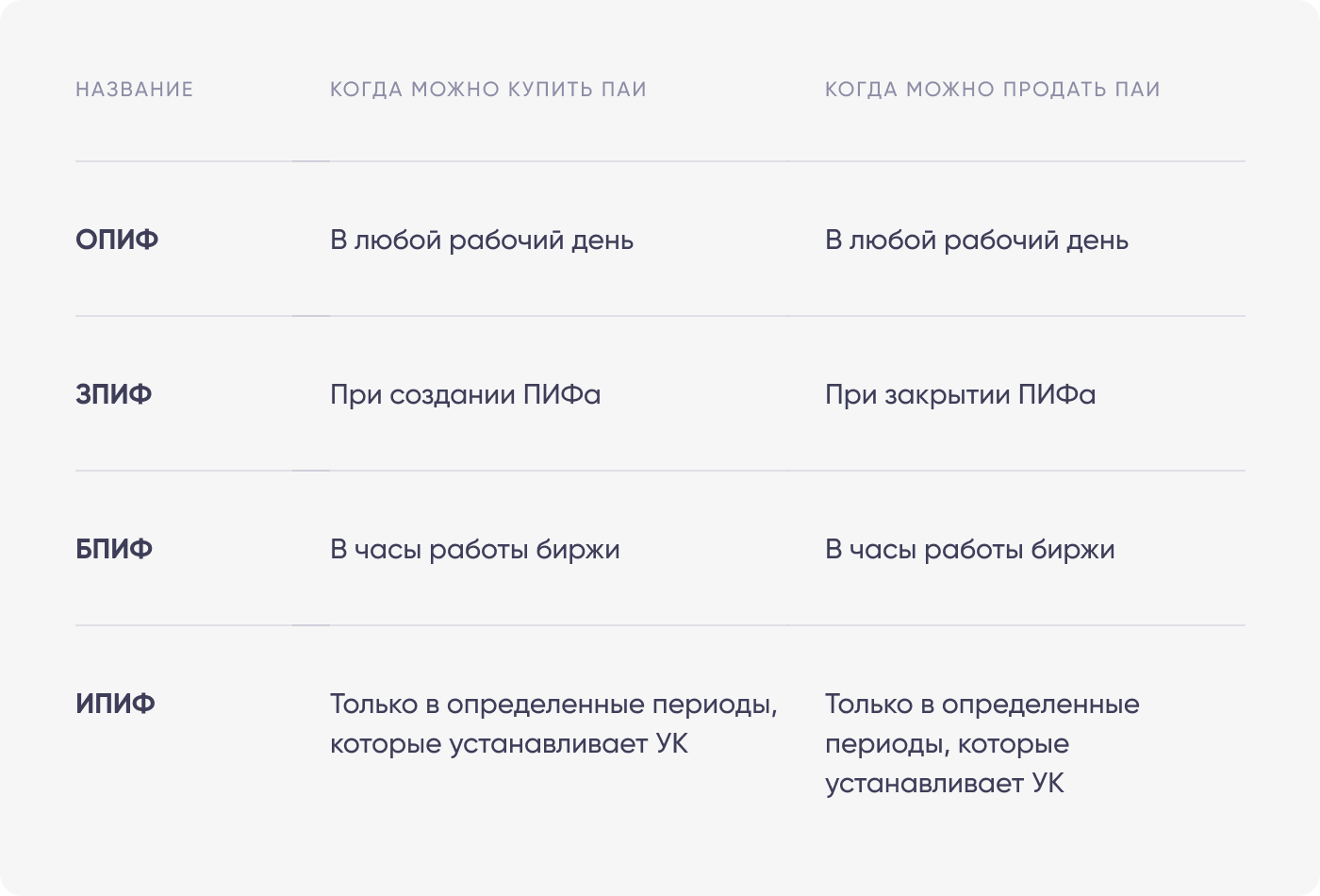 У разных фондов разные условия покупки и погашения паев. По этому параметру все ПИФы можно поделить на четыре типа.