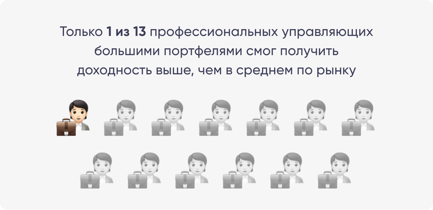 Даже профессиональные инвесторы не могут предсказать, кто станет лидером, а кто — аутсайдером. Одно исследование показало7, что на горизонте 15 лет лишь малая часть управляющих активами заработала большую доходность, чем все остальные. Только 1 из 13 менеджеров крупных портфелей и 1 из 23 управляющих небольших портфелей смогли превзойти средний результат. То есть шансы профессионалов составили примерно 0,08% и 0,04%. Остается только догадываться, какая вероятность обыграть рынок и выбрать «тот самый актив» у частного инвестора.
