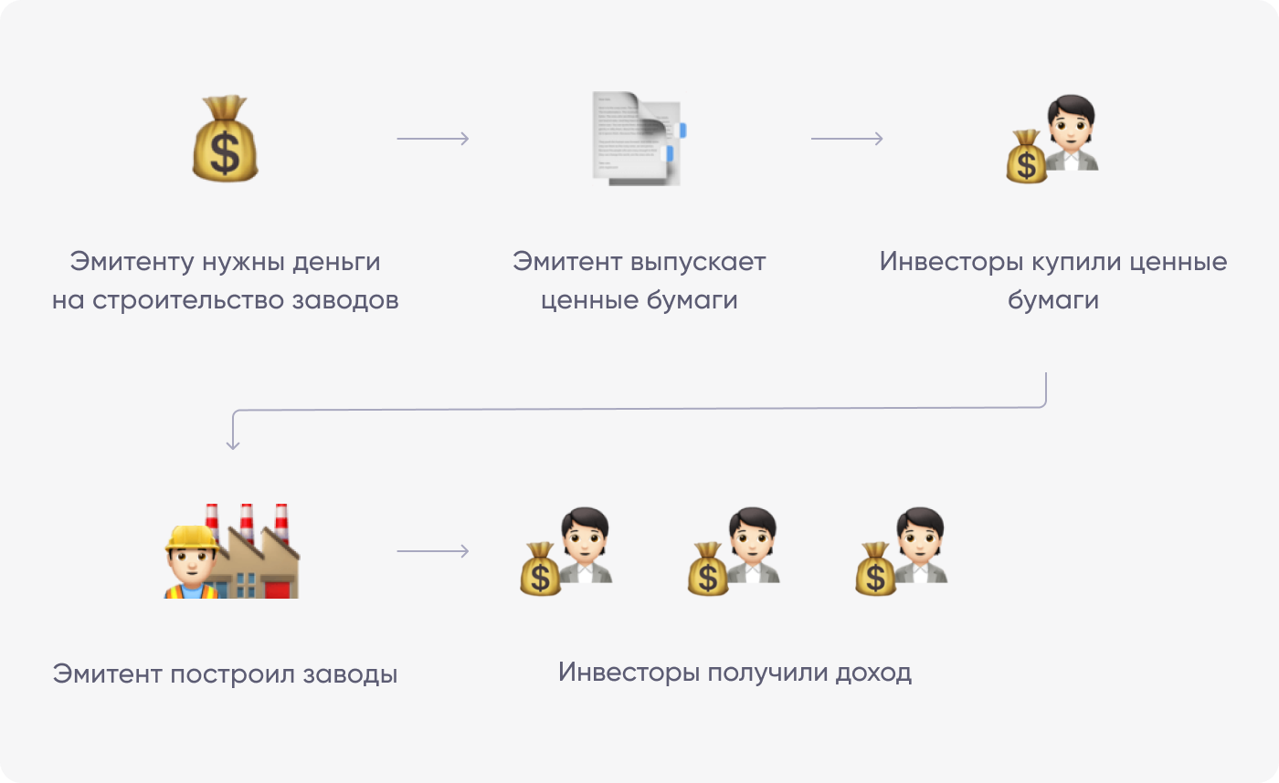 Эмитенты продают свои ценные бумаги покупателям. Когда покупатель приобретает ценную бумагу, он становится инвестором. Если инвестиция окажется удачной, инвестор заработает на своем вложении.