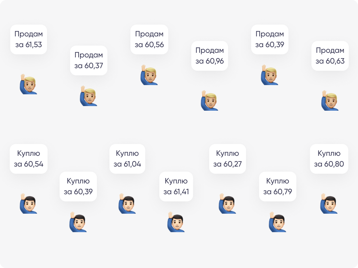 На фондовой бирже все заявки анонимные. Ни покупатели, ни продавцы не видят, с кем именно они заключают сделки
