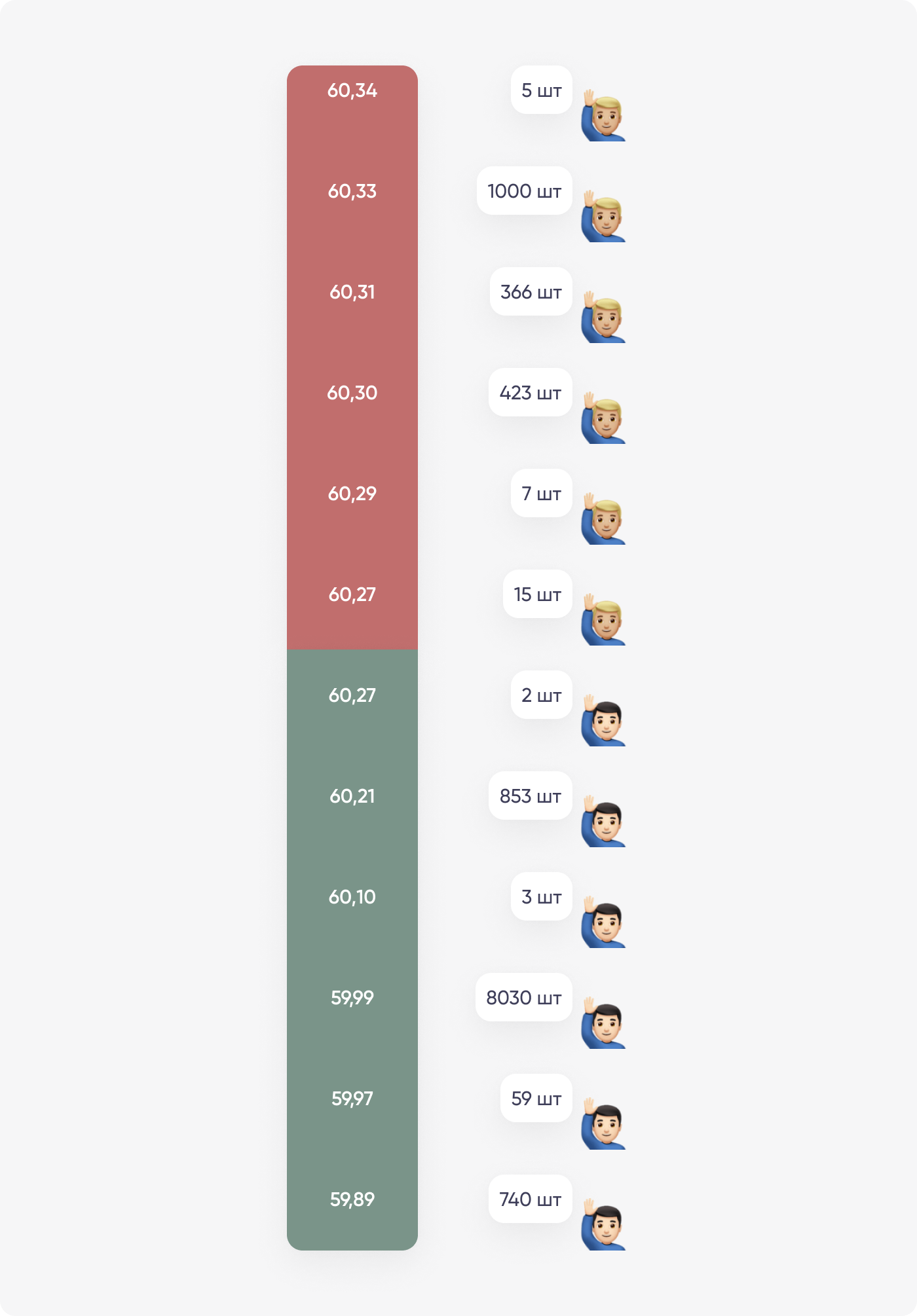 Биржа делит эту очередь на две группы: заявки на покупку и заявки на продажу.
