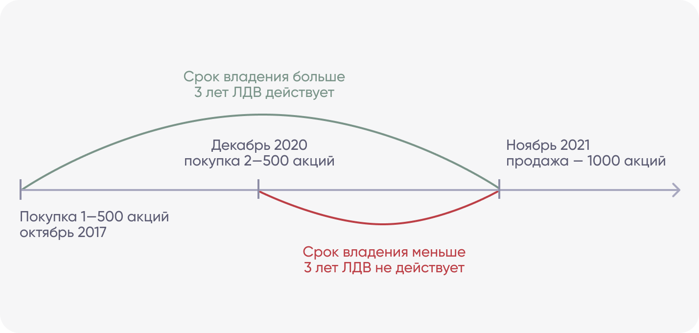 Например, инвестор в октябре 2017 года приобрел 500 акций одной компании, в декабре 2020 года купил еще 500, а в ноябре 2021 года продал все бумаги. С момента первой покупки прошло четыре года — ЛДВ действует. С момента второй менее года — ЛДВ не действует.