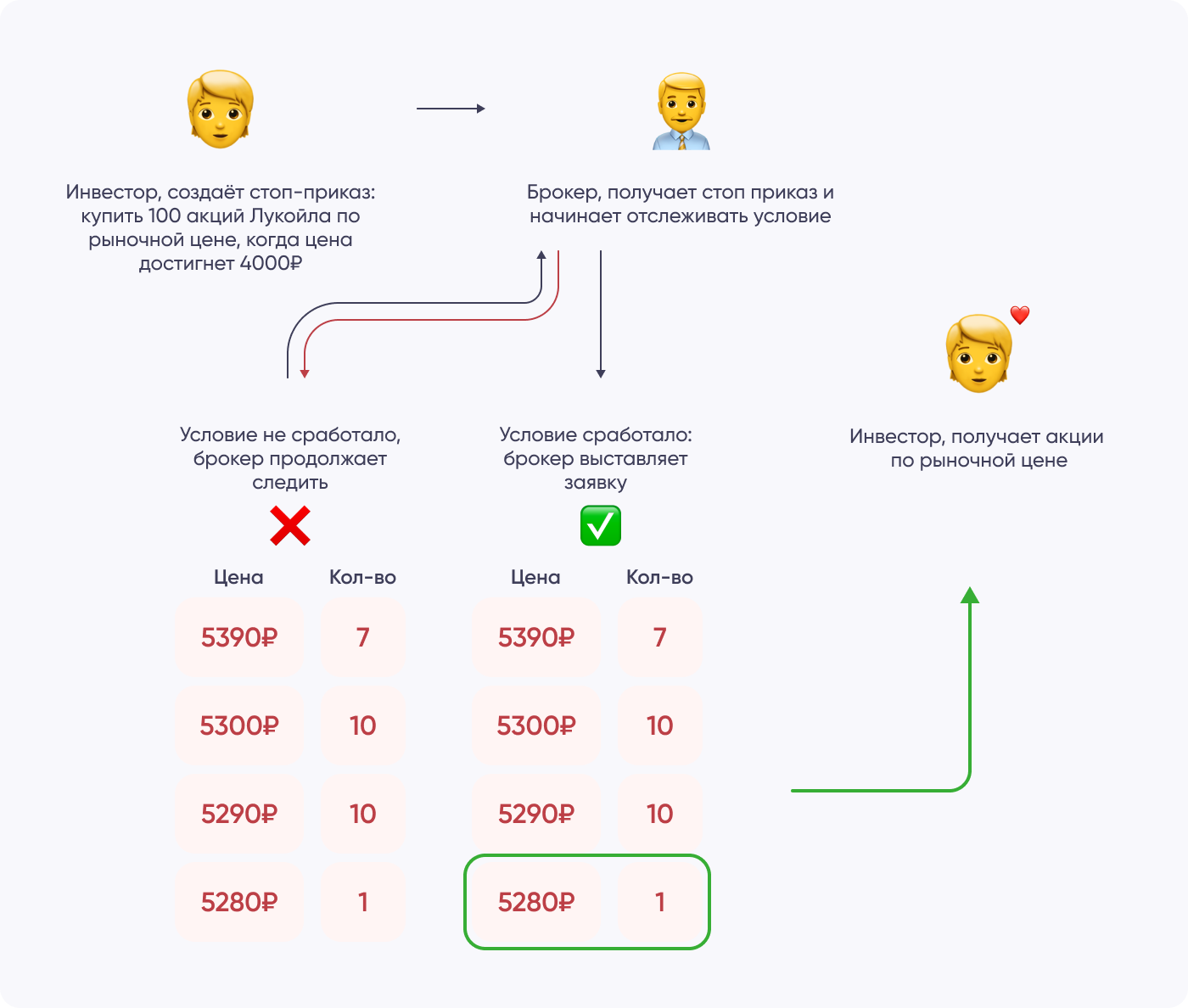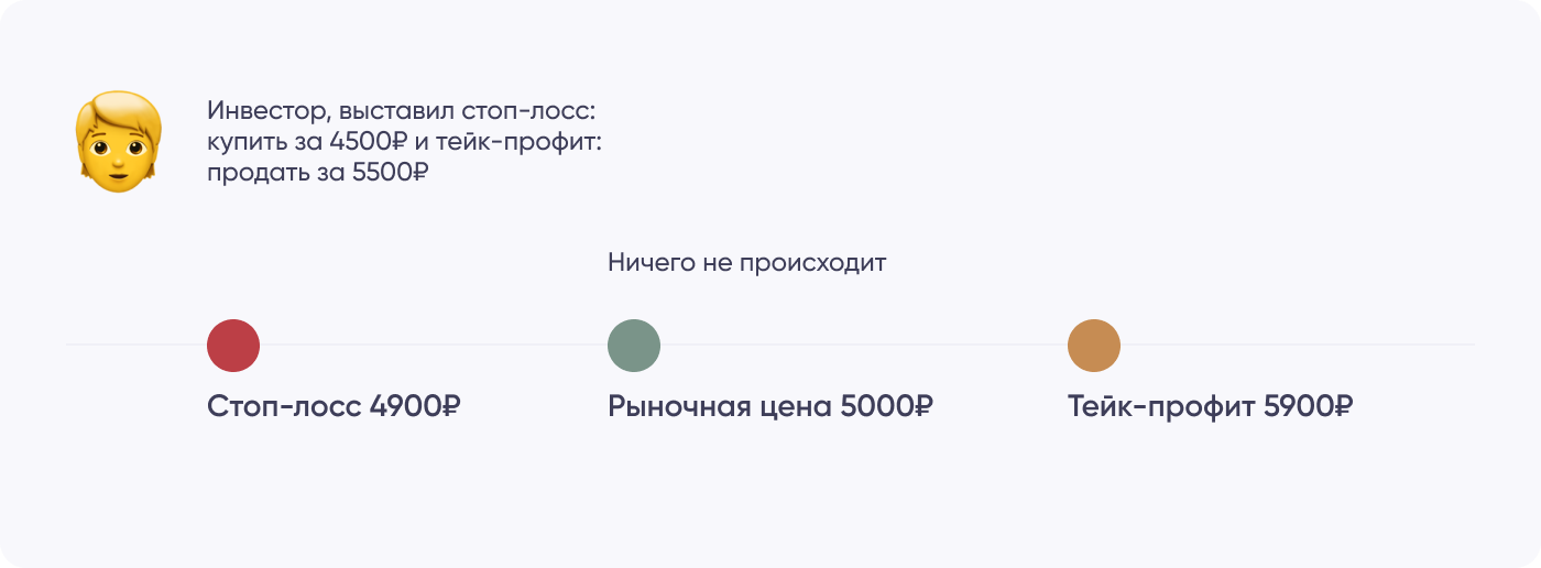 Допустим, инвестор купил акции Лукойла1 за 5000 ₽. Пока цена меняется: то 5500 ₽, то 5100 ₽. Но инвестор предполагает, что она может резко упасть, к примеру до 3800 ₽. Чтобы защитить себя от риска, инвестор может выставить стоп-лосс — поручение продать акции, если цена упадет до 4900 ₽. Так инвестор уменьшит свой потенциальный убыток до 100 ₽.