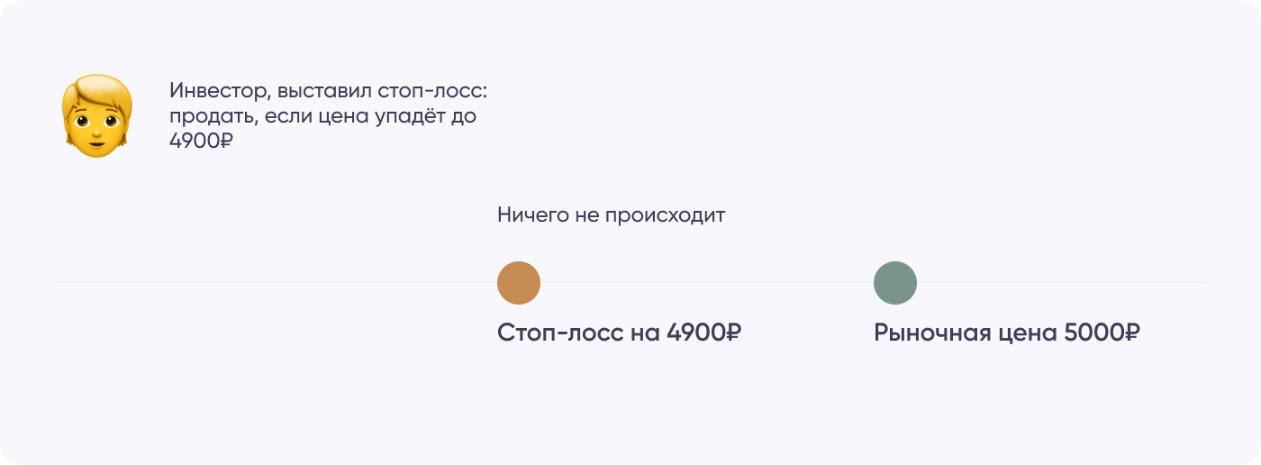 Пока цена выше 4900 ₽, с бумагами инвестора ничего не происходит: они лежат в портфеле. Но как только система отслеживания цен зафиксирует сделку по цене ниже 4900 ₽, брокер отправит заявку на продажу и закроет сделку.