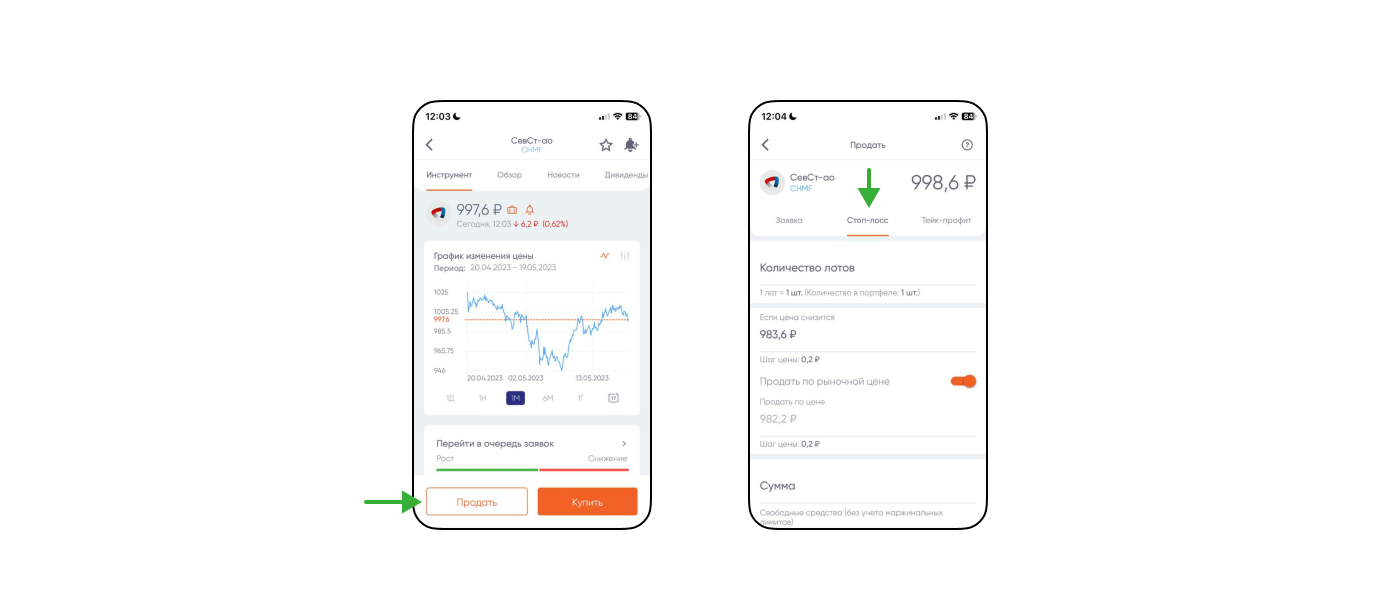 Как выставить стоп-лосс в приложении «ПСБ Инвестиции». Нужно перейти в приложение, выбрать бумагу и нажать «Продать» или «Купить». Затем в верхнем меню выбрать пункт «Стоп-лосс» ↓