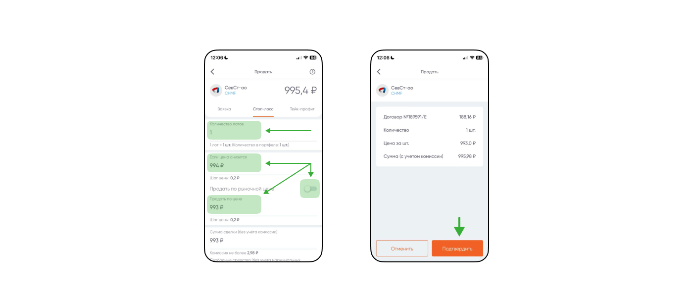Дальше нужно выставить параметры: количество лотов, условие активации заявки и цену исполнения. А в конце — подтвердить стоп-лосс ↓