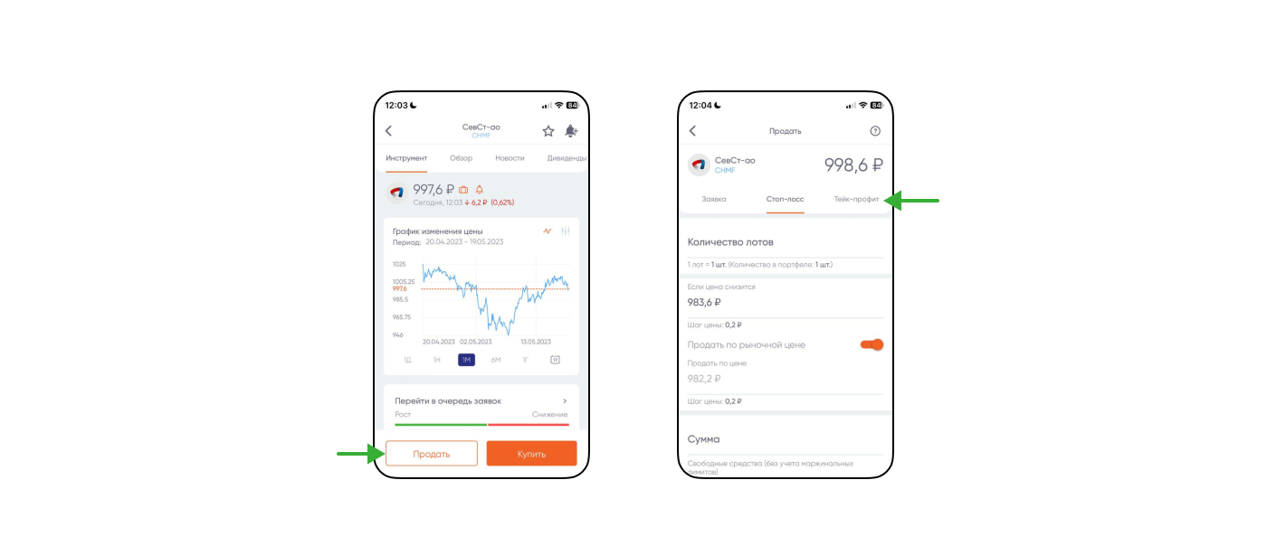 Как выставить тейк-профит в приложении «ПСБ Инвестиции». Нужно перейти в приложение, выбрать бумагу, нажать «Продать», а затем в верхнем меню выбрать пункт «Тейк-профит» ↓
