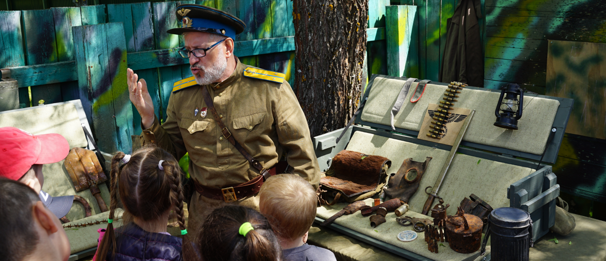 После мастер-класса добровольцы из ПСБ отправились вместе с детьми на ознакомление экспонатов времен Великой Отечественной войны. В организации экскурсии помог Московский областной оборонно-спортивный клуб «Ратник».